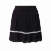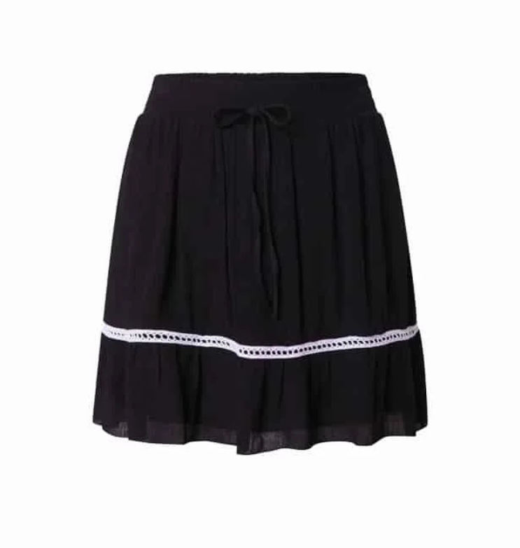 Mot. sijonas, juodos spalvos, elastingas juosmuo, mini ilgis, surišami raišteliai, baltų nėrinių dekoras.
