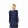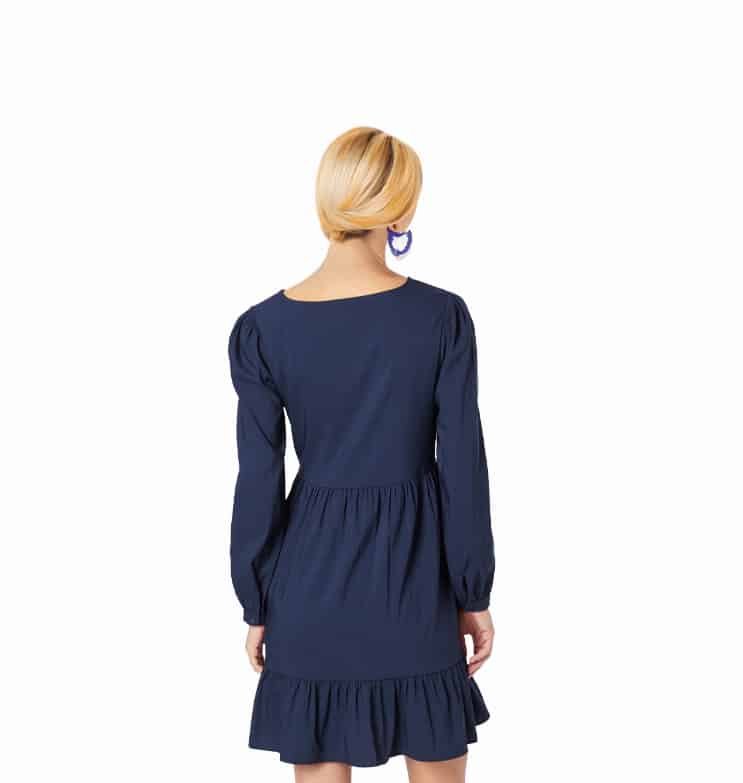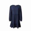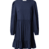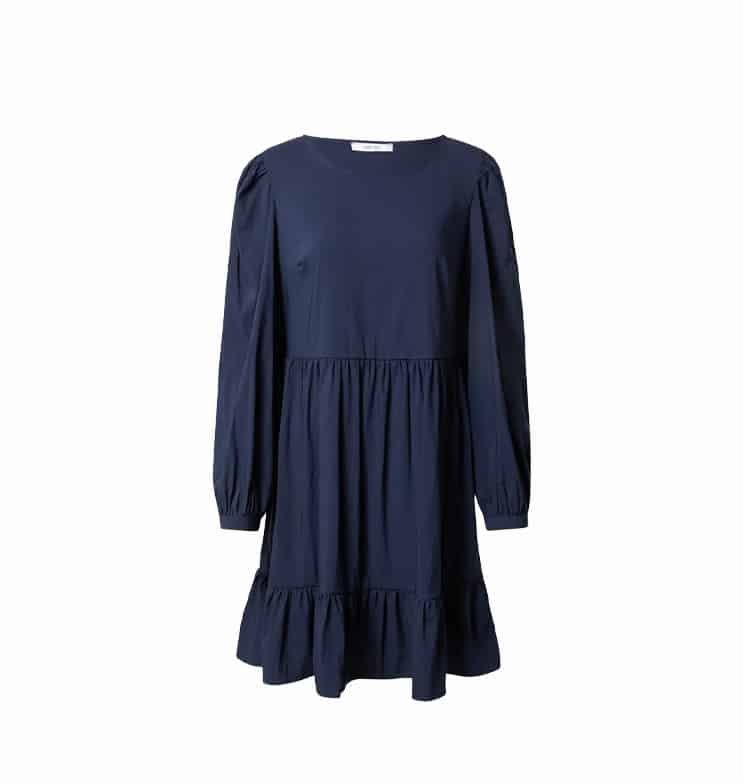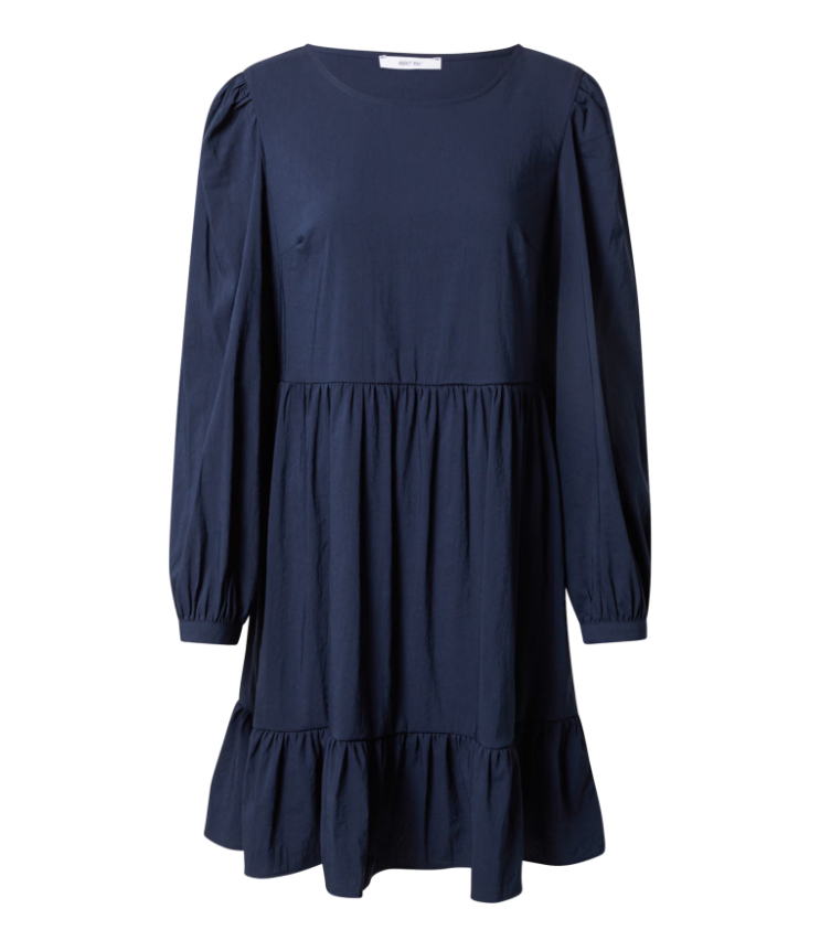 Mot. suknelė, tamsiai mėlynos spalvos, ilgomis rankovėmis, apvali iškirptė, pūstomis rankovėmis.