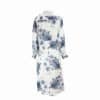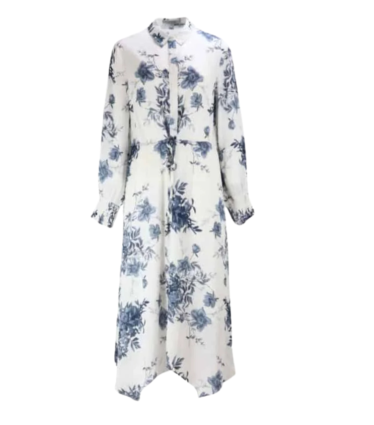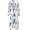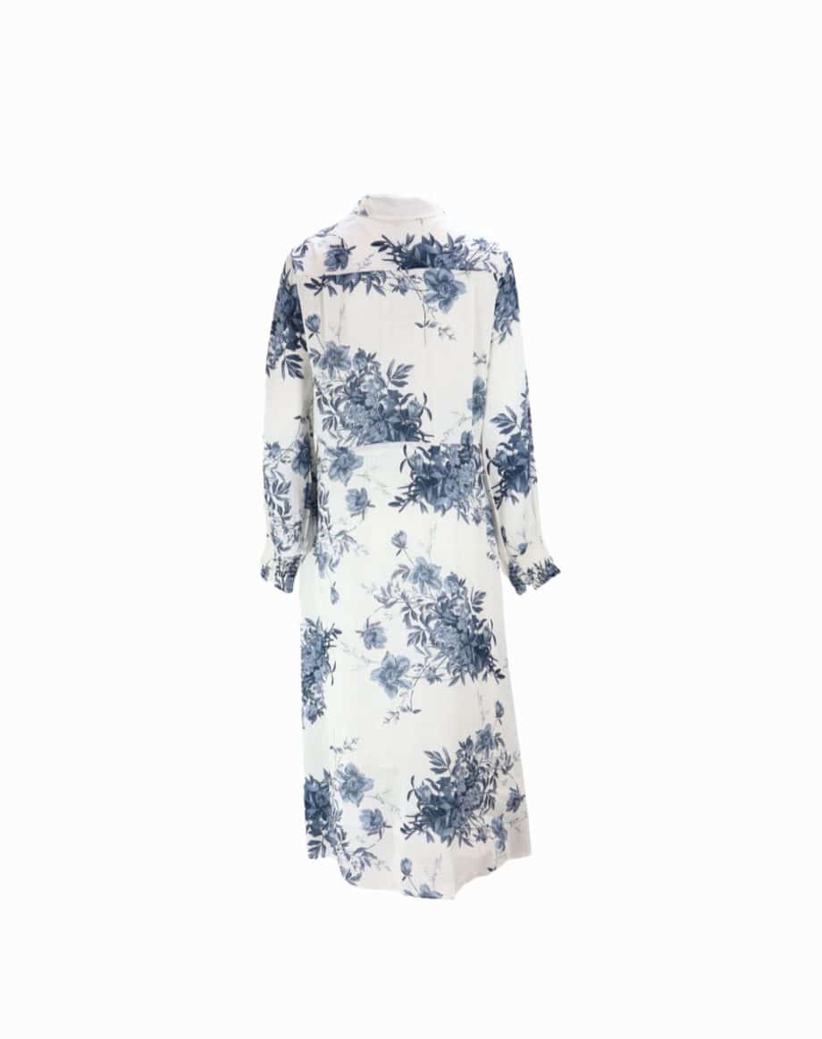 Mot. suknelė, baltos spalvos, mėlynais gėlių raštais, ilgomis rankovėmis, marškinių apykaklė, priekyje sagos leidžiančios reguliuoti iškirptę, ties juosmeniu raištelis.