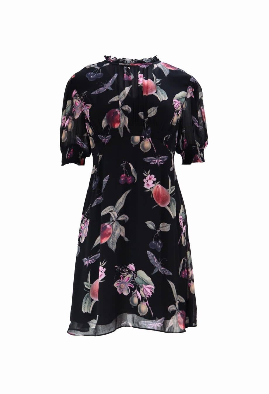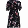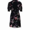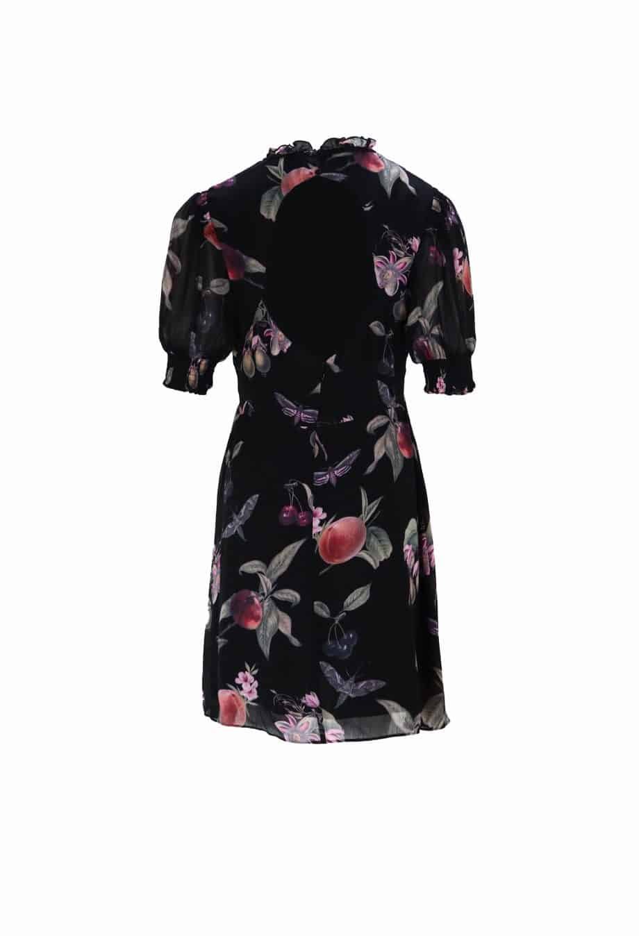 Mot. suknelė, juodos spalvos, raštuota, trumpos rankovės, elastingas juosmuo, stati apykaklė, gili V formos iškirptė nugaroje, užsegimas sagute,trumpa, beveik permatoma.