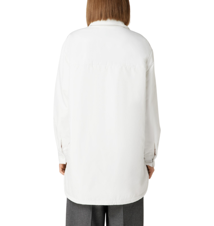 Mot. striukė, baltos spalvos, ilgomis rankovėmis, atlenkiama apykaklė, laisvo kirpimo, užsegimas spaudėmis per visą ilgį, kišenės ant krūtinės.