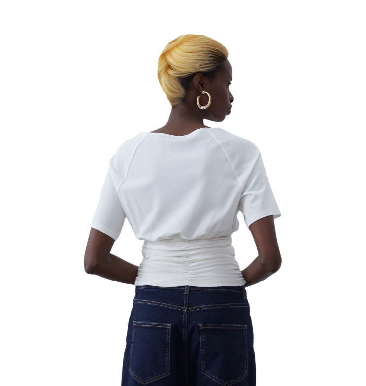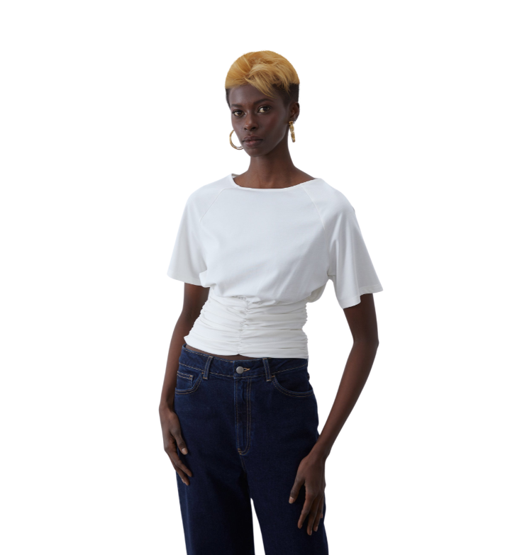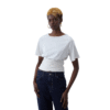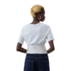 Mot. palaidinė, baltos spalvos, trumpomis rankovėmis, apvali kaklo iškirptė, vienspalvis raštas.