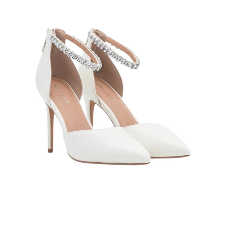 Mot. klasikiniai aukštakulniai, baltos spalvos, smaili batų nosis, užsegimas užtrauktuku, smailiakulnė avalynė, netikri briliantai.