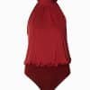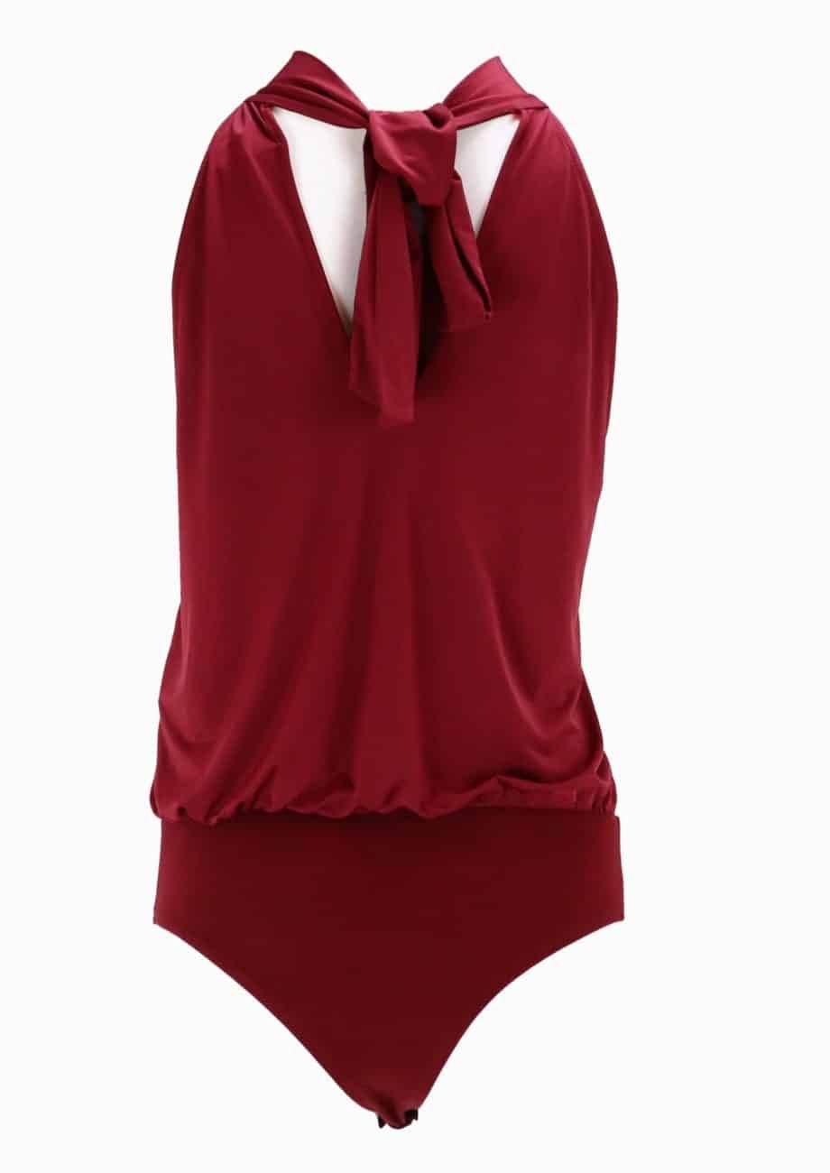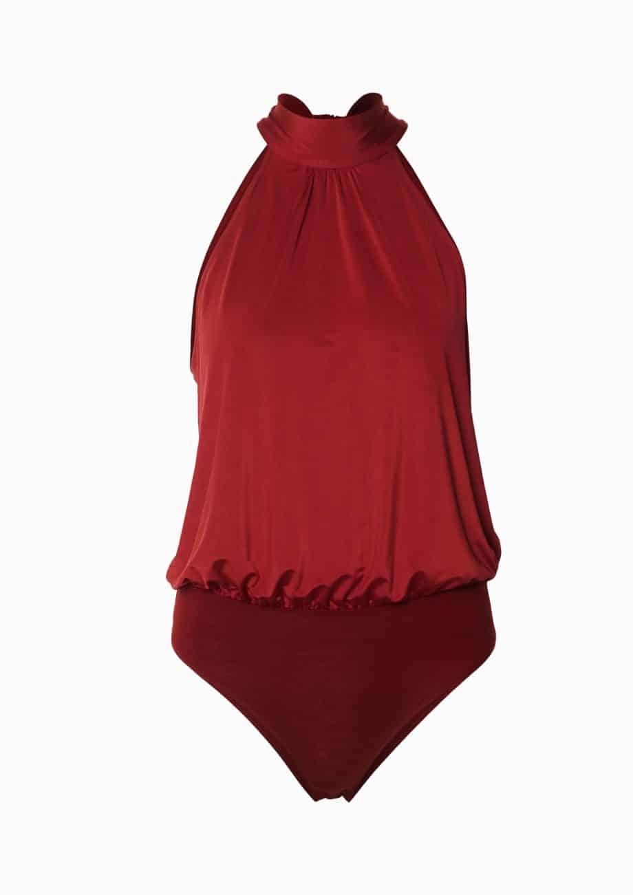 Mot. topas, bordo spalvos, be rankovių, apykaklė stati, užsegimas apačioje, užsegimas sagute.