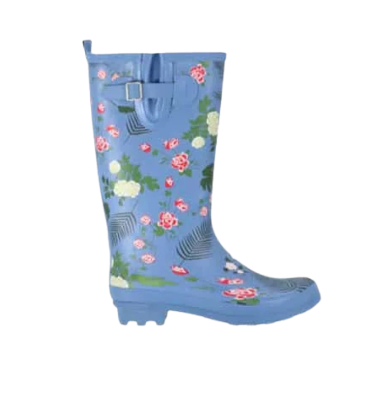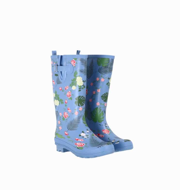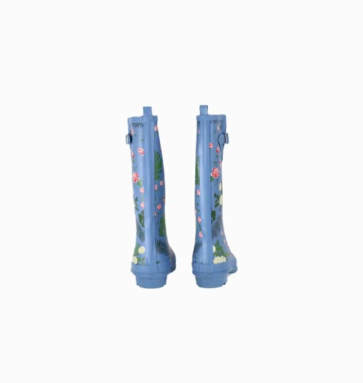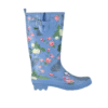 Mot. lietaus batai, žydros spalvos, apvali batų nosis, blokinis kulnas, be užsegimo, spausdintas gėlių raštas, atsparūs vandeniui.