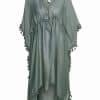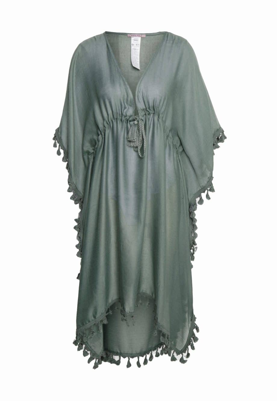Mot. paplūdimio suknelė, chaki spalvos, permatoma, asimetrinė su kutukais, per liemenį sutraukiama.
