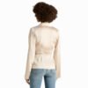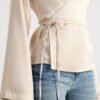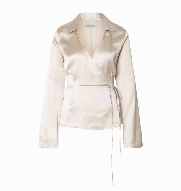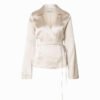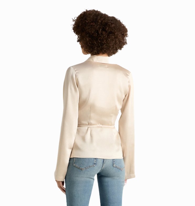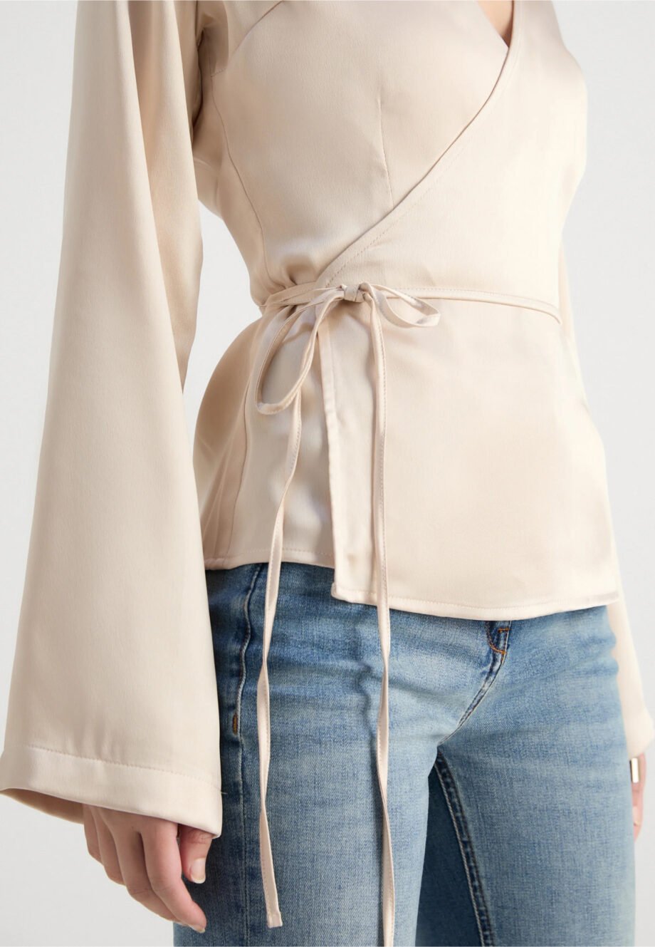 Mot. palaidinė, smėlio spalvos, V formos iškirptė, ilgos rankovės, surišama per liemenį, atlenkiama apykaklė.