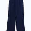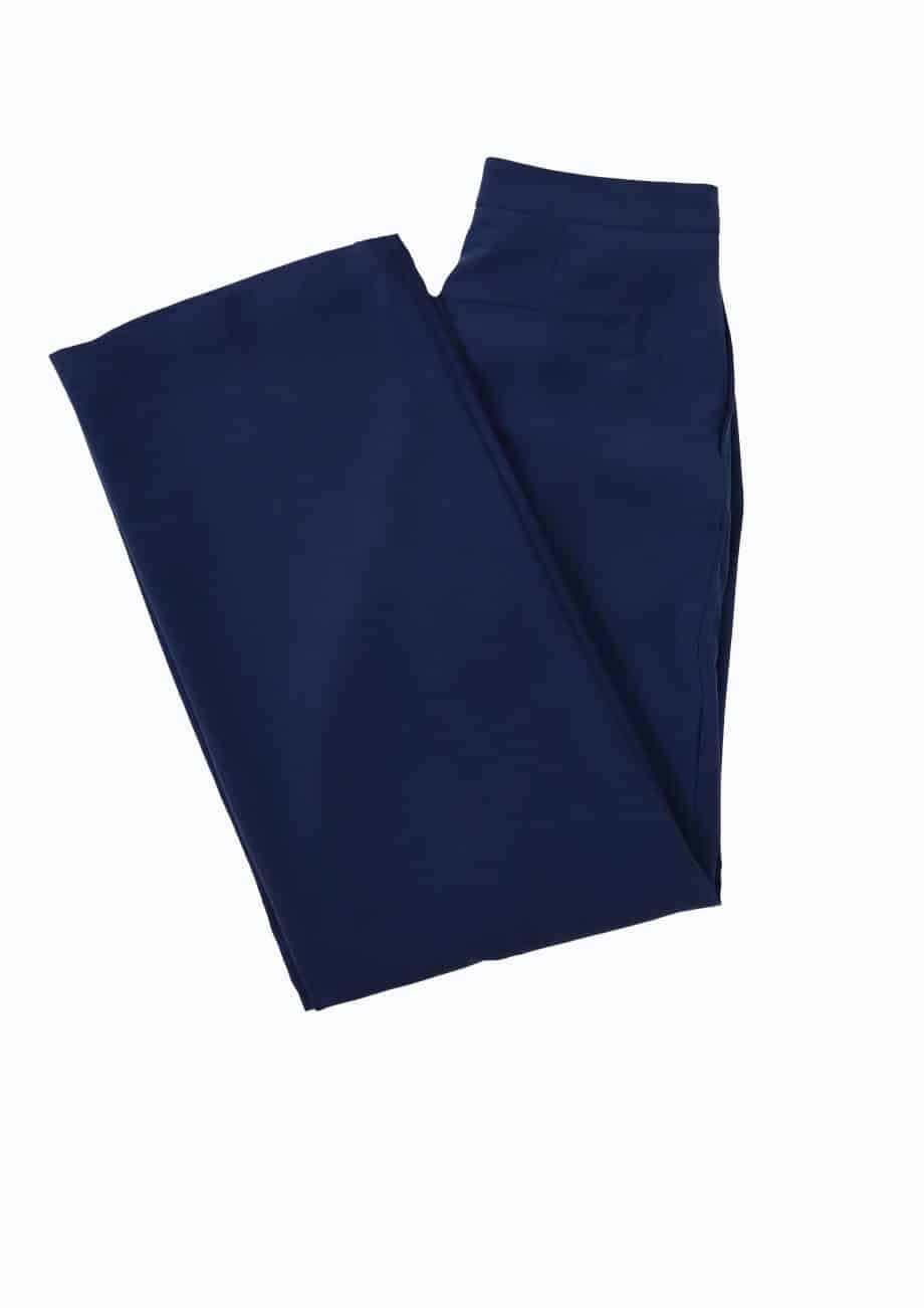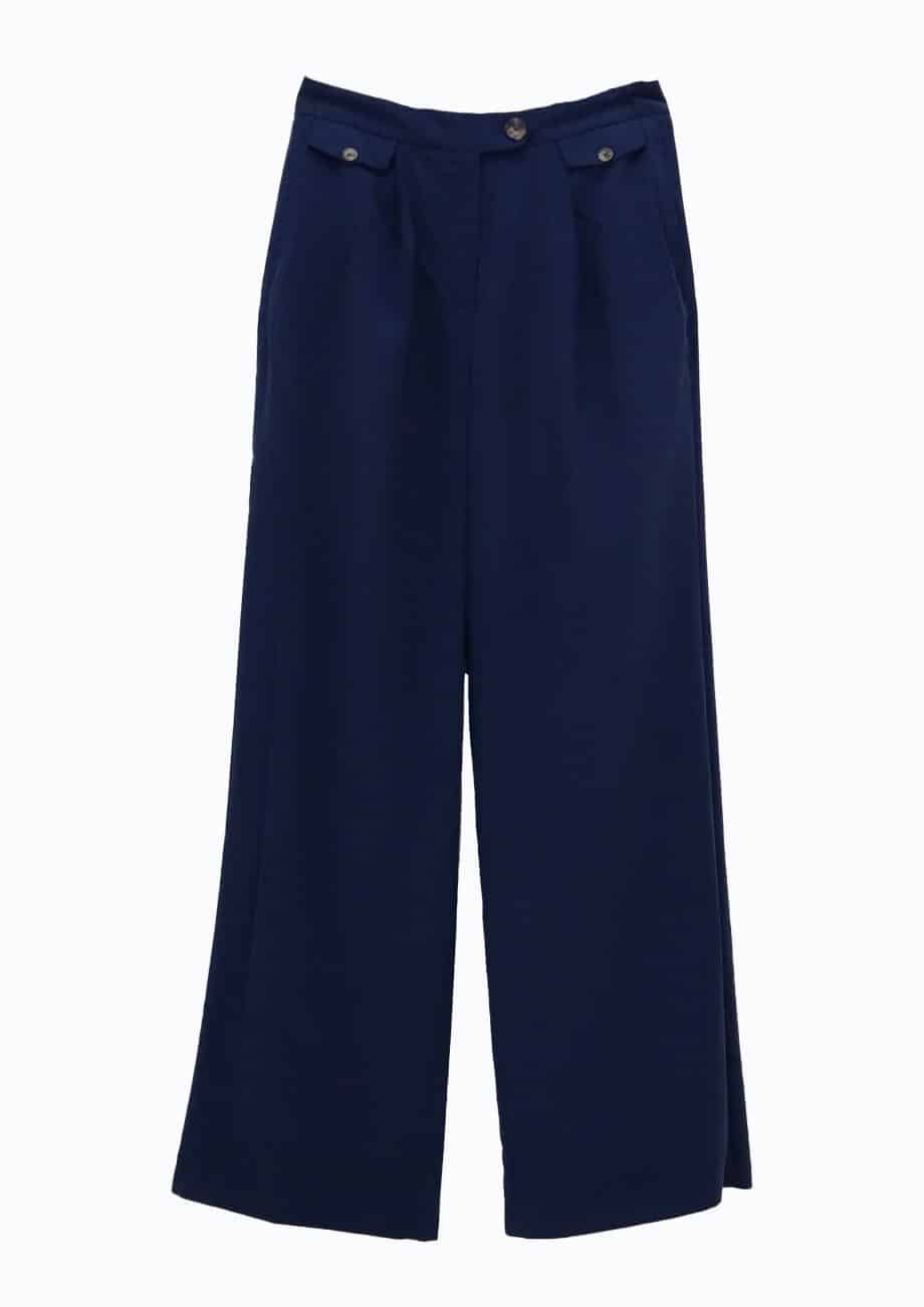 Mot. kelnės, mėlynos spalvos, aukštas liemuo, užsegimas sage ir užtrauktuku, priekinės ir galinės kišenės,tiesaus kirpimo.