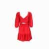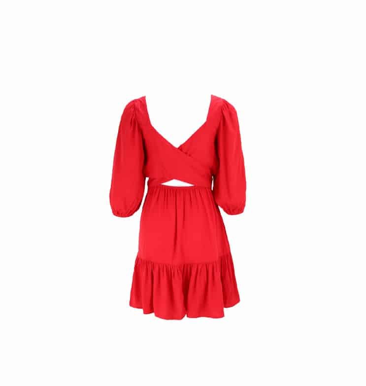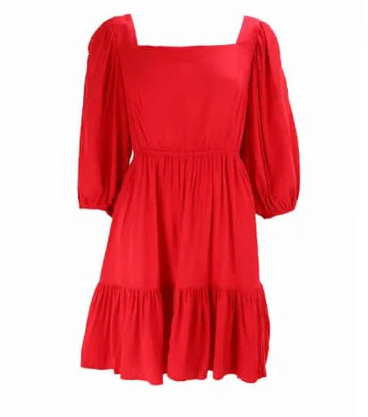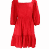 Mot. suknelė, raudonos spalvos, 3/4 rankovės, kvadratinė iškirptė, mini ilgis, surišama nugaroje, elastingas juosmuo, pūstos rankovės.