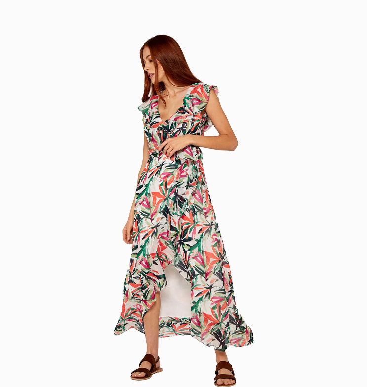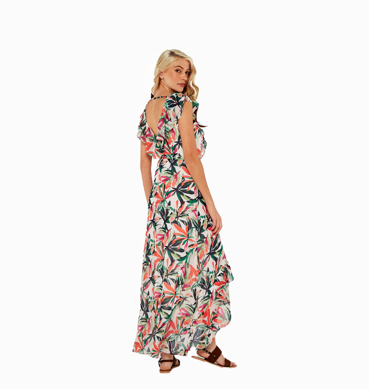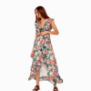 Mot. suknelė, spalvota, be rankovių, gėlėtas raštas, V formos iškirptė, su raukiniais.