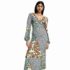 Mot. suknelė, spalvota, gėlėtas raštas, ilgomis rankovėmis, V formos iškirptė, atvira nugara.