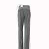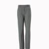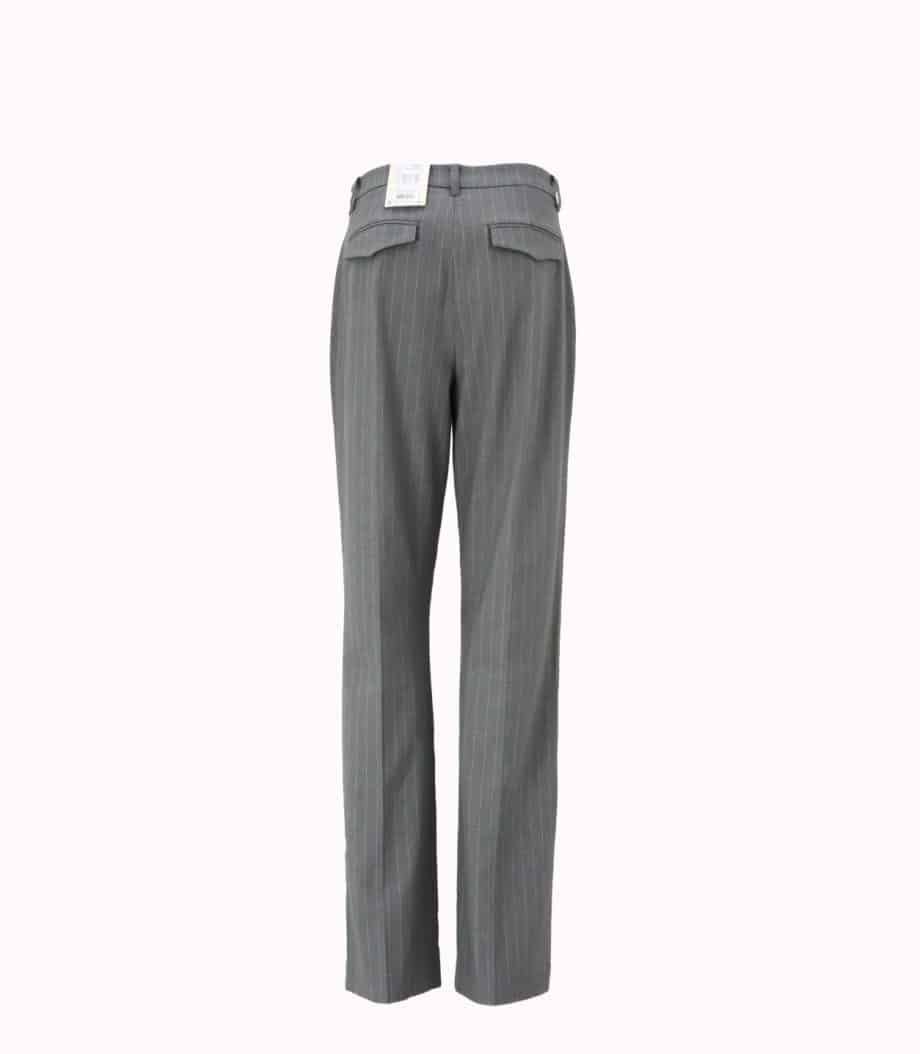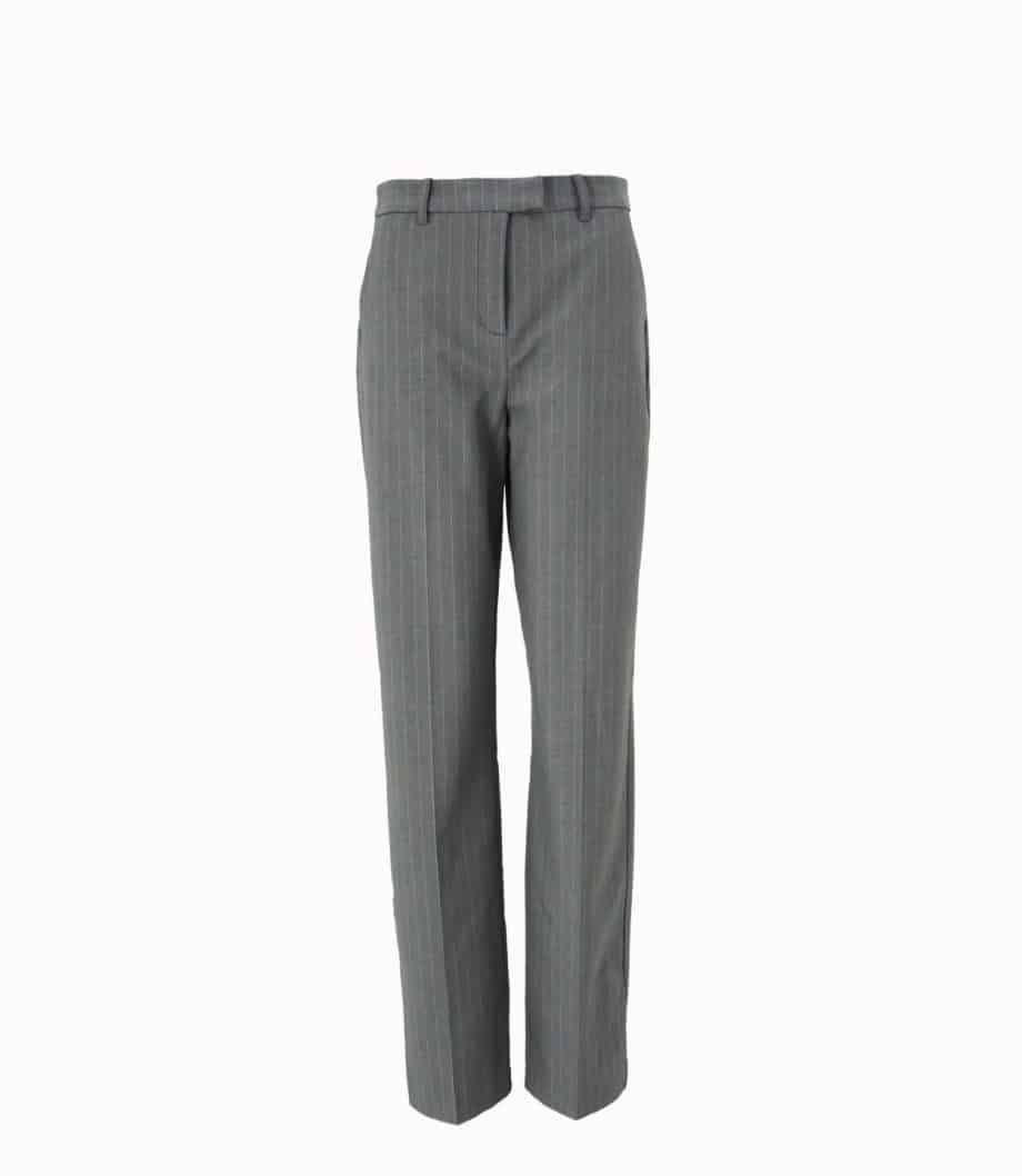 Mot. kelnės, pilkos spalvos, tiesaus silueto, šoninės kišenės, ploni šviesūs ruoželiai, juosmuo aukštas, kirpimas platus.