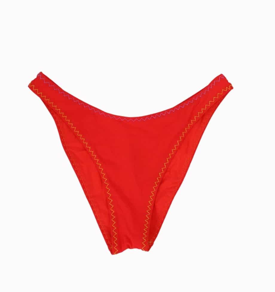 Mot. maudymosi kelnaitės, oranžinės spalvos, aukštas juosmuo, geltonos ir violetinės spalvos siūlės.