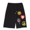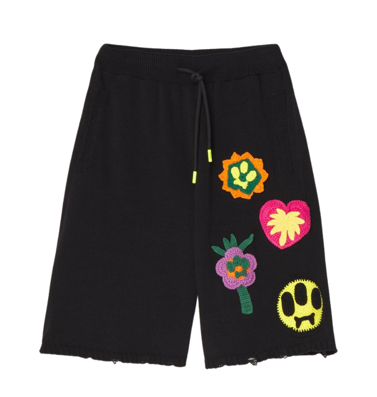 Unisex šortai, juodos spalvos, šoninės kišenės, gėlių aplikacija, elastingas juosmuo, tiesaus kirpimo, megzto rašto.