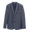Vyr. švarkas mėlynos spalvos, ilgomis rankovėmis, atlenkiama apykaklė, V formos iškirptė, šoninės kišenės.