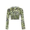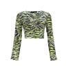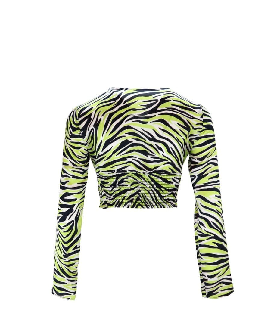 Mot. palaidinė, žalios spalvos, trumpa Crop top stiliaus, ilgomis rankovėmis, V formos iškirptė, užsegimas kabliukais, dryžuotas raštas.