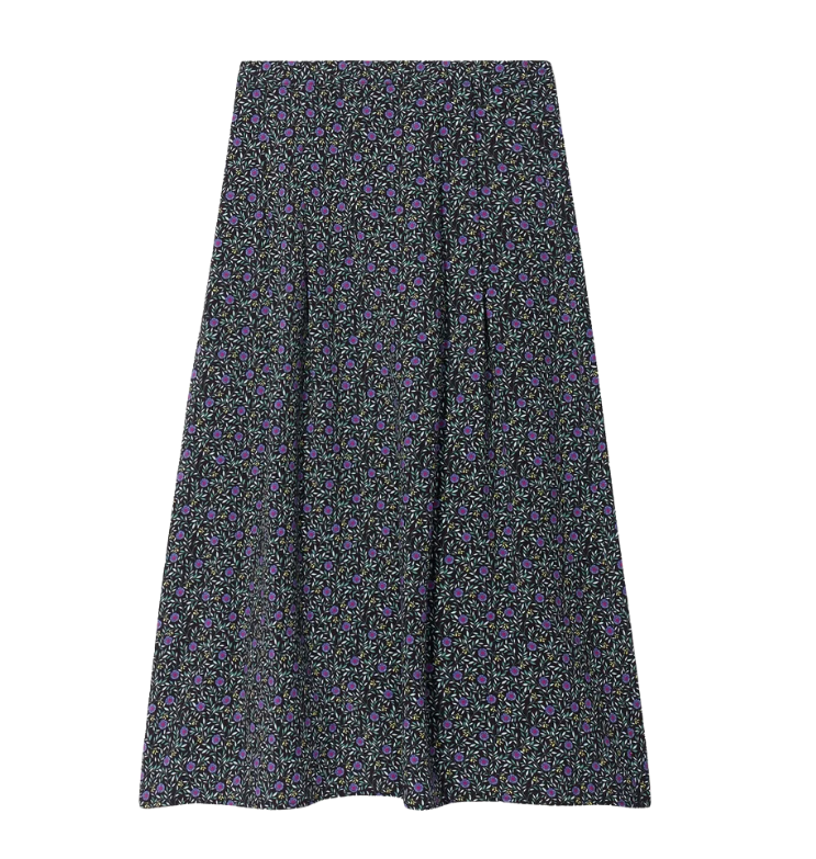 Mot. sijonas, juodos spalvos, gėlių raštas, elastingas juosmuo, midi ilgis, platėjančio kirpimo, be užsegimo.