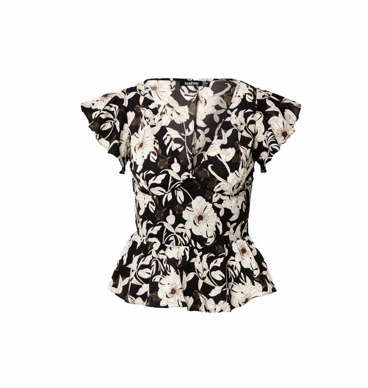 Mot. palaidinė, juodos spalvos, trumpomis rankovėmis, gili V formos iškirptė, gėlių raštas, užsegimas užtrauktuku, rauktiniai.