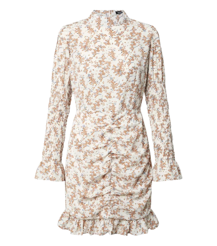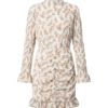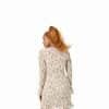 Mot. suknelė, baltos spalvos, ilgomis rankovėmis, smulkiu gėlėtu raštu, priglunda prie kūno.