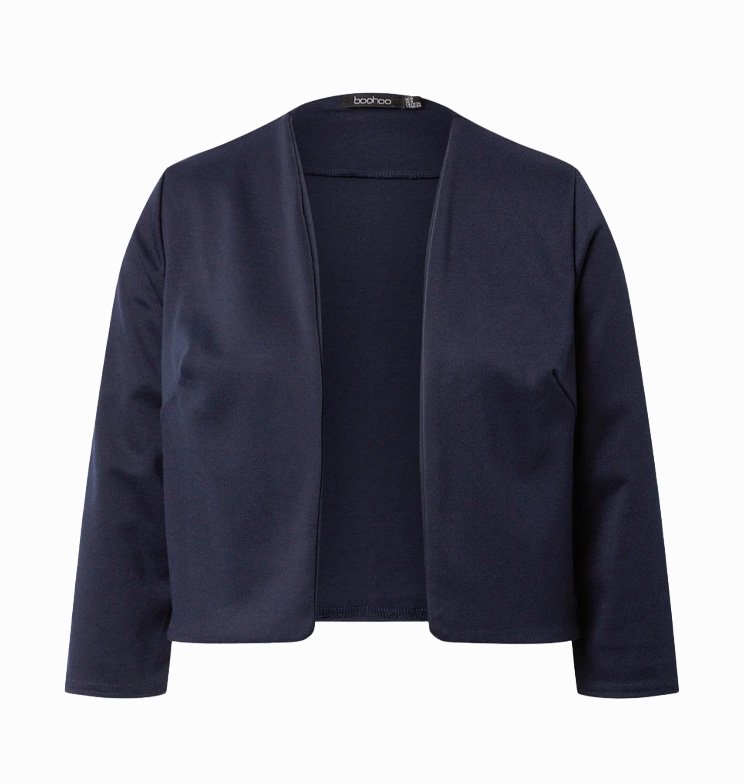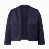 Mot. švarkelis, tamsiai mėlynos spalvos, klasikinio dizaino be sagų, ilgomis rankovėmis.