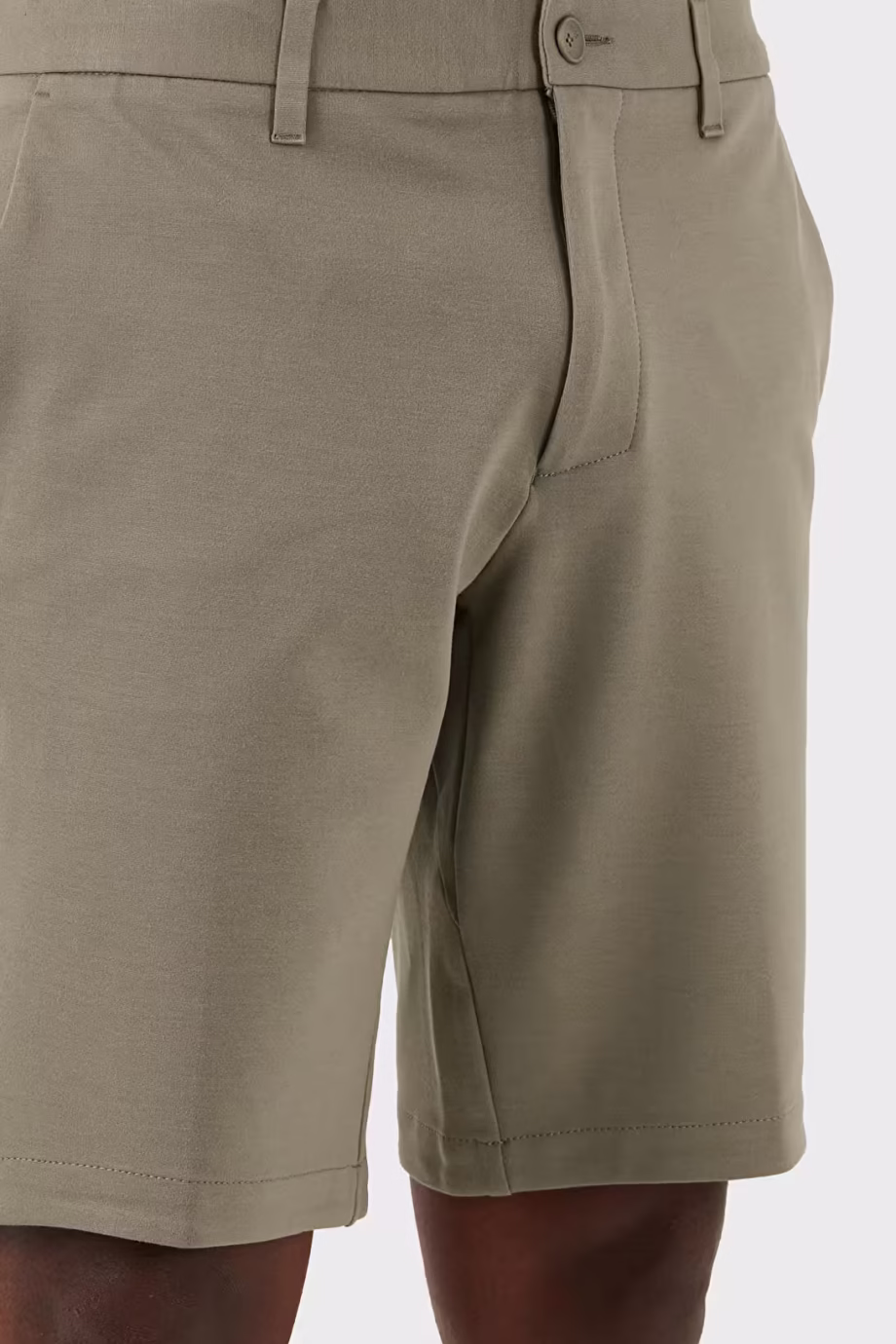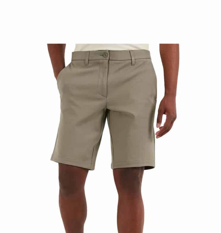 Vyr. šortai, chaki spalvos, šoninės ir užpakalinės kišenės, užsegimas užtrauktuku saga, spausdintas logotipas.