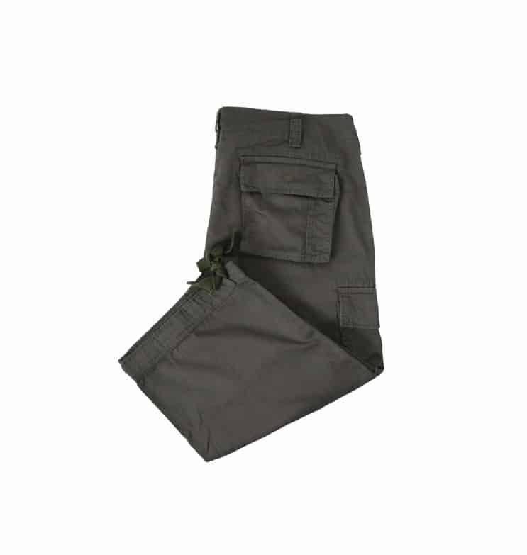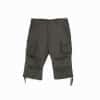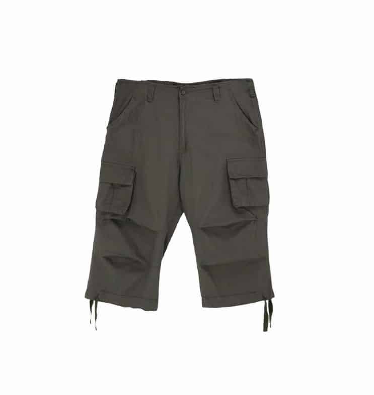 Vyr. šortai, tamsiai žalios spalvos, kargo stiliaus, trijų ketvirčių ilgio, šoninės kišenės, užsegimas užtrauktuku ir saga, diržo kilpos.
