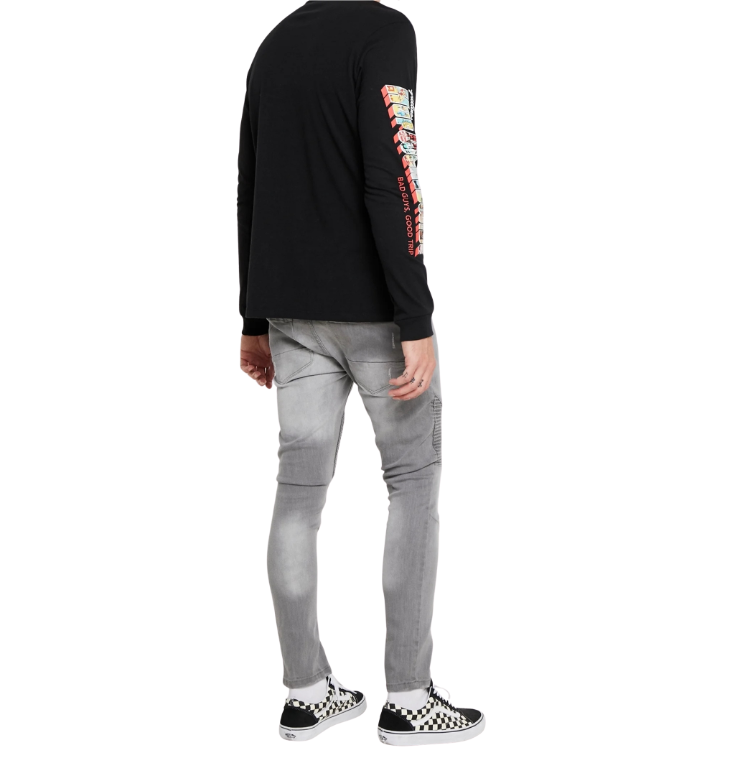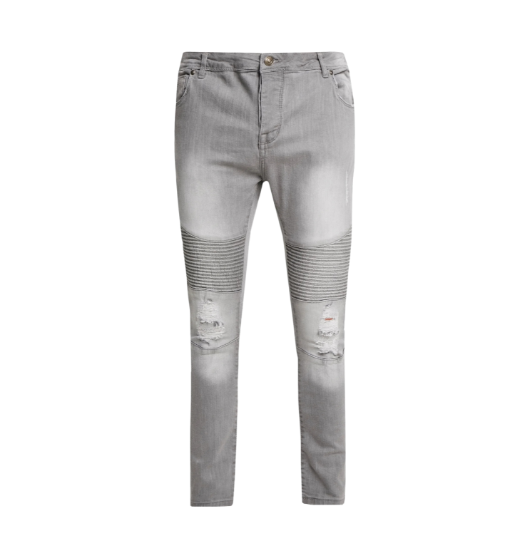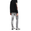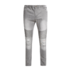 Vaik. džinsai, pilkos spalvos, paplėšyti, 5 kišenių dizainas, kilpa diržui, užsegimas sagomis.