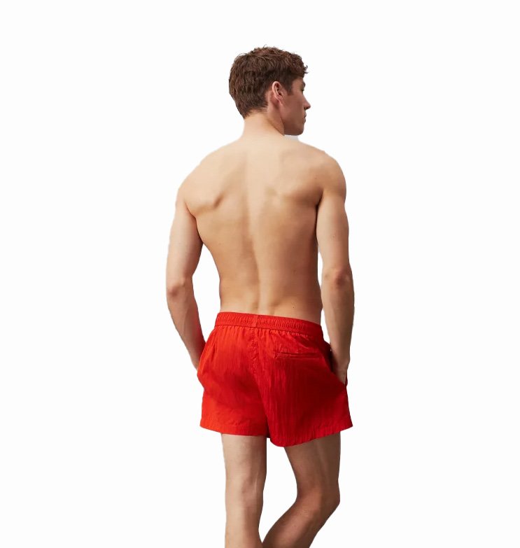 Vyr. maudymosi šortai, raudonos spalvos, elastinė juosmens juosta su raišteliais, kišenės, tinklinis pamušalas, siuvinėtos logotipo detalės.