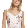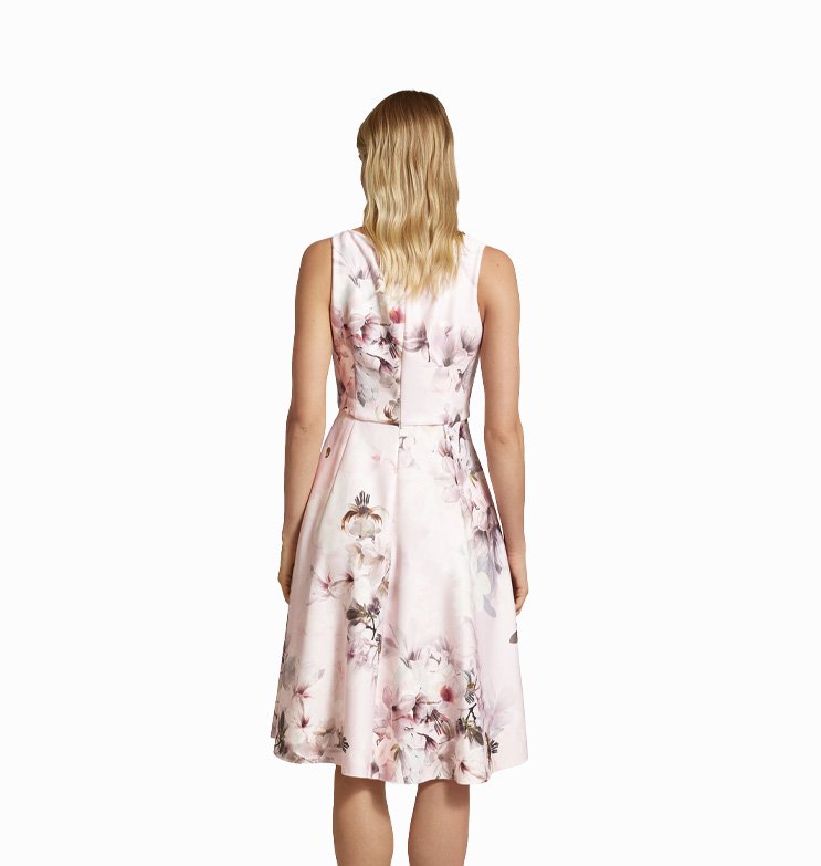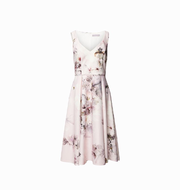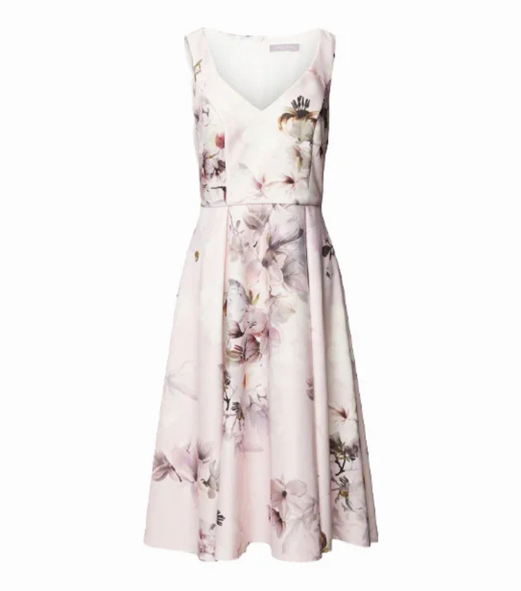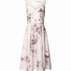 Mot. suknelė, šviesiai rožinės spalvos, be rankovių, gili V formos iškirptė, užsegimas užtrauktuku.
