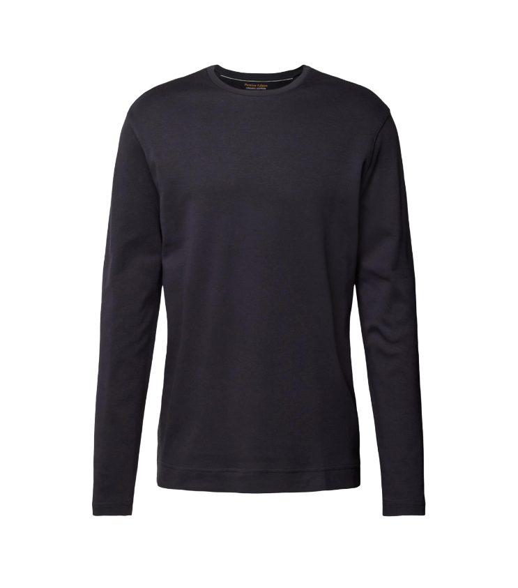 Vyr. marškinėliai ilgomis rankovėmis, juodos spalvos, tiesus kirpimas, įgulos kaklas, šiek tiek perlenkti pečiai. kasdienio stiliaus.