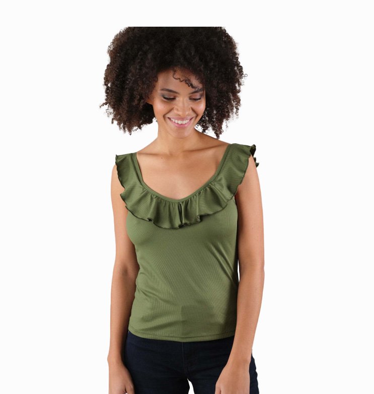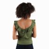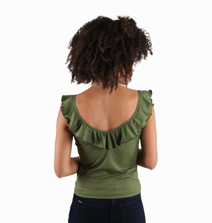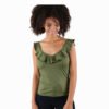 Mot. palaidinė, žalios spalvos, V formos gili iškirptė, be rankovių, prigludusi prie kūno, nėriniuotos šleikutės, logotipo detalė.