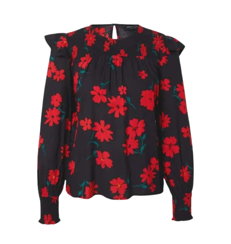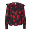 Mot. palaidinė, juodos spalvos, ilgomis rankovėmis, apvali iškirptė, užsegimas nugaroje su sagute, gėlių raštas, raukti- elastingi rankogaliai.