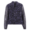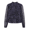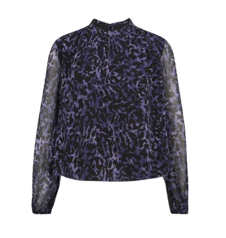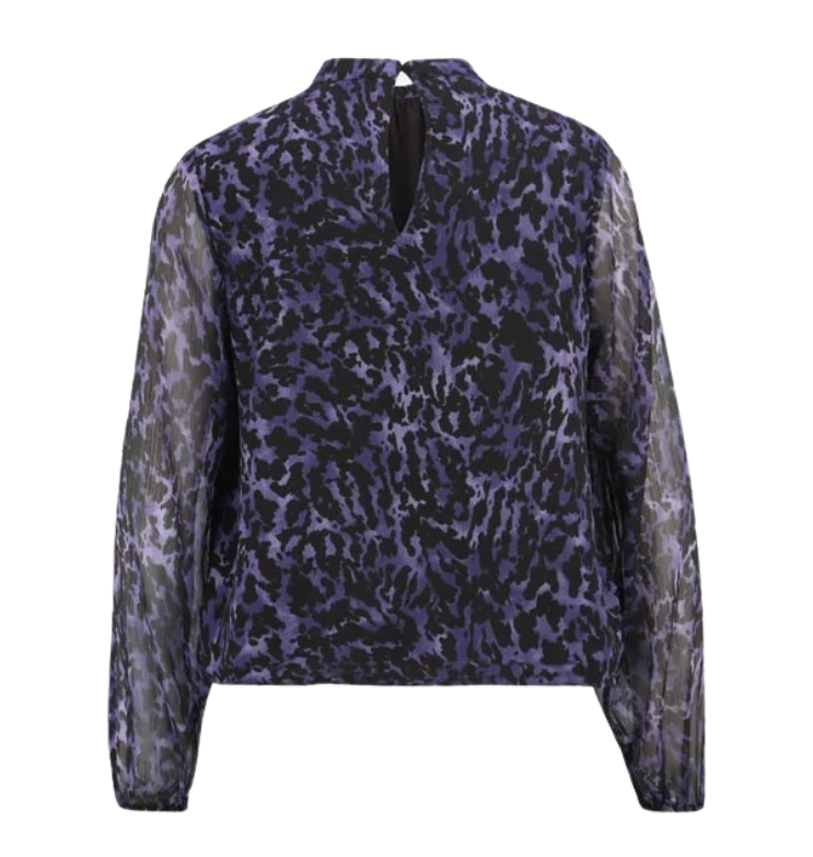 Mot. palaidinė, violetinės spalvos, ilgomis rankovėmis, apvali iškirptė, gyvūno raštas, stati apykaklė, užsegimas nugaroje sagute, permatomas dizainas.