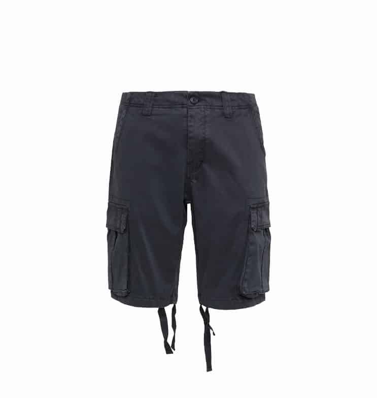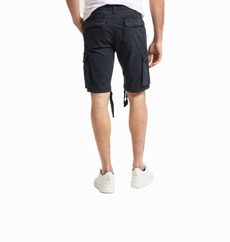 Vyr. šortai, tamsiai mėlynos spalvos, "cargo" stiliaus, užsegimas su saga ir užtrauktuku, kilpeles diržui, apačioje reguliuojami raišteliai, šoninės kišenės.