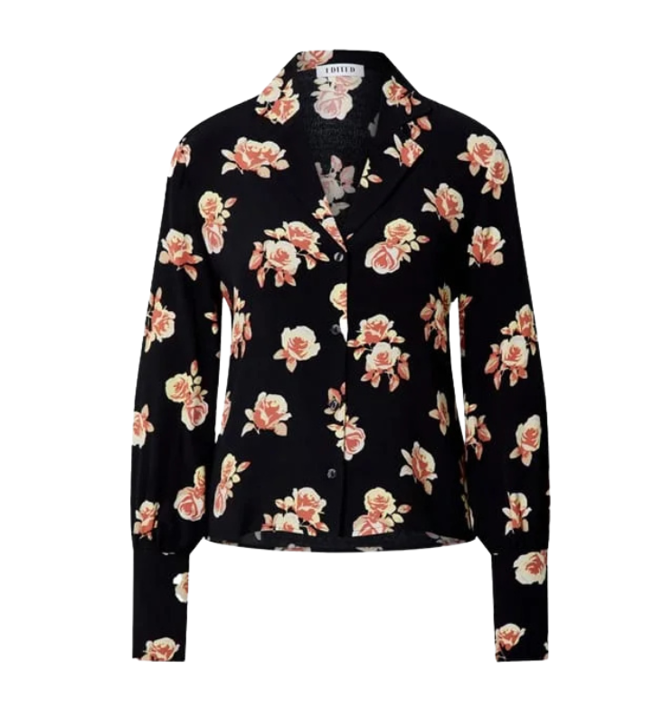 Mot. marškiniai, juodos spalvos, gėlių raštas, ilgomis rankovėmis, užsegimas per visą ilgį, turi V formos iškirptė.