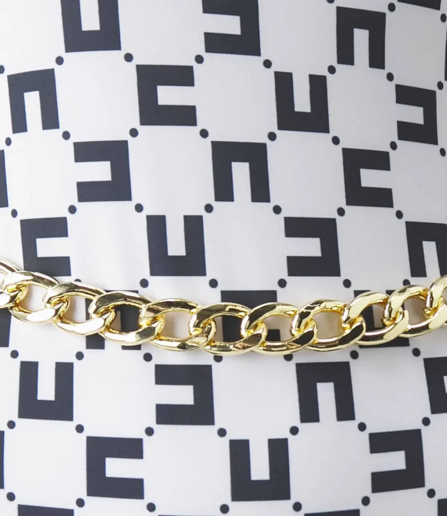 Mot. maudymosi kostiumėlis, vientisas, baltos/ juodos spalvos, be lankelių ir pakietinimų, nugaros kirpimas, be užsegimo, auksinės spalvos metalo papuošimas, atsegamas.