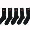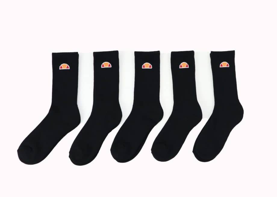 Unisex sportinės kojinės, juodos spalvos, ilgos, prekės ženklo logotipas virš kulkšnies, ribuoti rankogaliai, priglundančios. Pakuotėje 5 poros