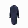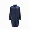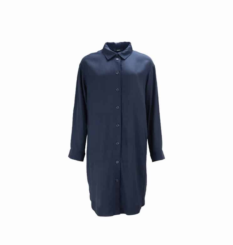 Mot. suknelė, tamsiai mėlynos spalvos, ilgomis rankovėmis, marškinių apykaklė, užsegimas sagomis, šoninės kišenės, laisvo kirpimo, ilgis iki kelių.