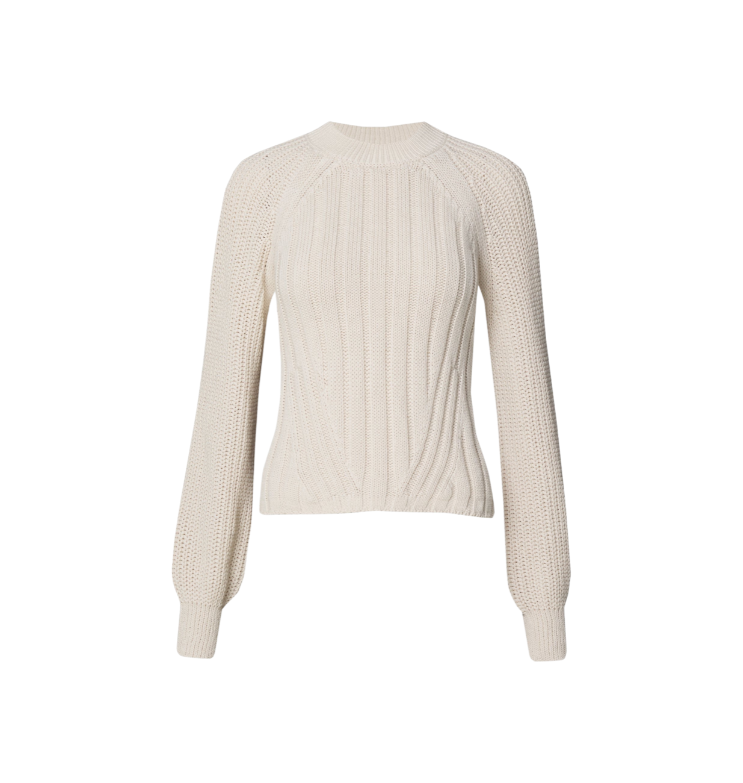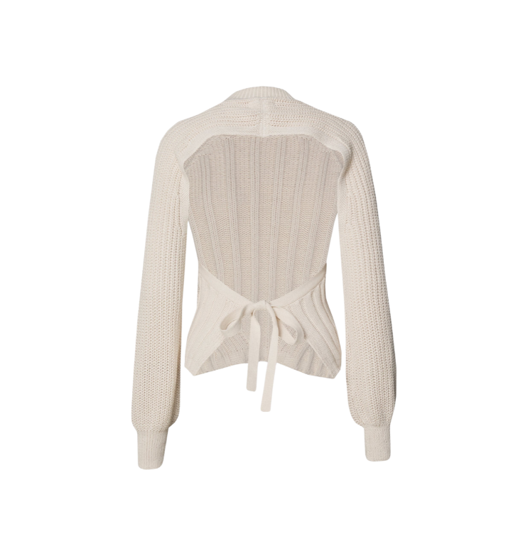 Mot. megztinis, smėlio spalvos, ilgos plačios rankovės, apvali kaklo iškirptė, surišama nugaroje.