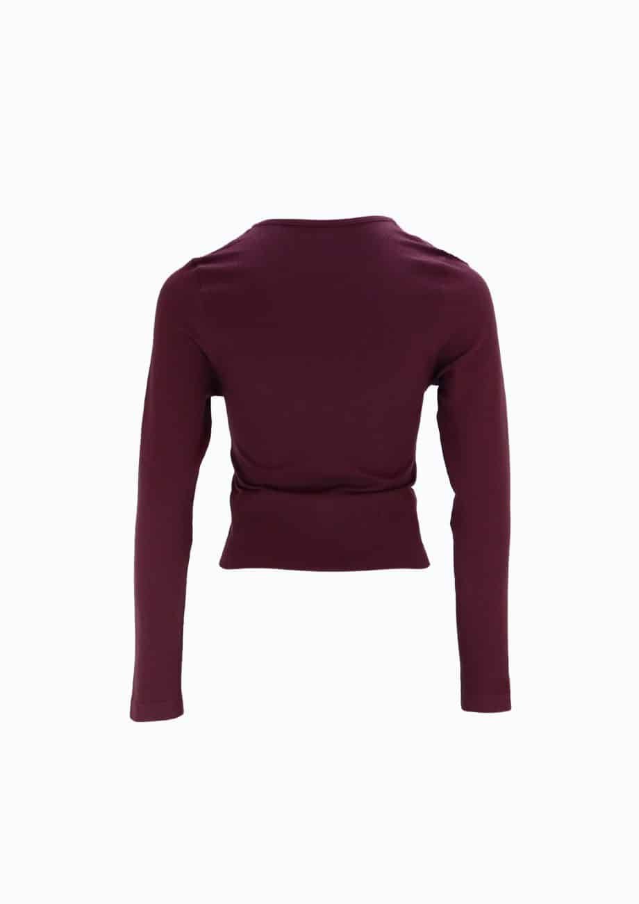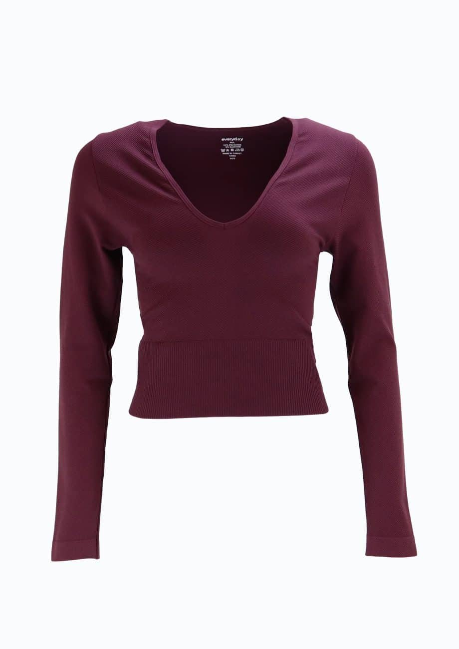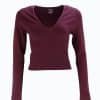 Mot. sportinė palaidinė, vyšninės spalvos, besiūlė, ilgomis rankovėmis, gili V formos iškirptė, Crop Top stiliaus.