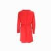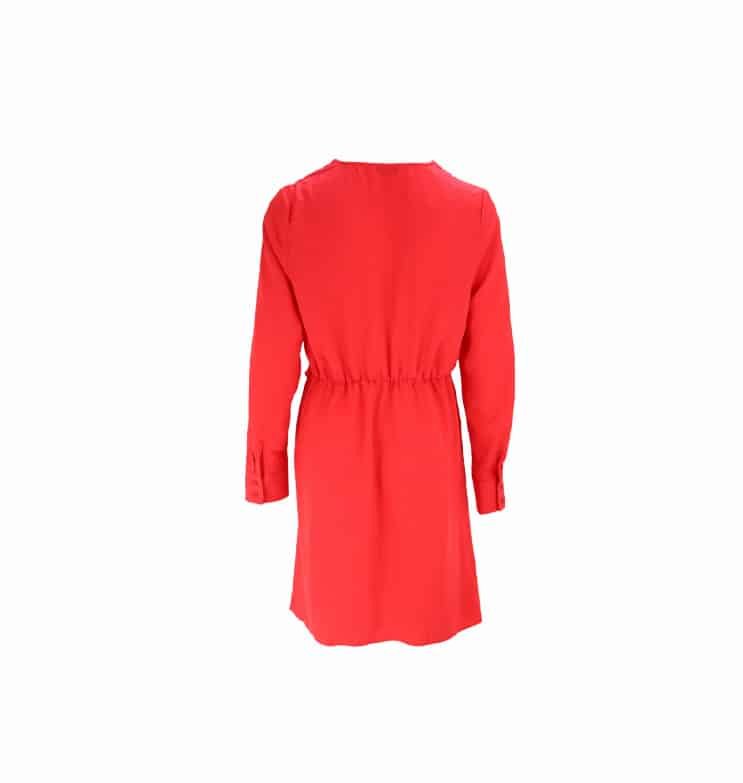 Mot. suknelė, raudonos spalvos, ilgomis rankovėmis, turi V formos iškirptė, rankovių gale sagutės.