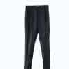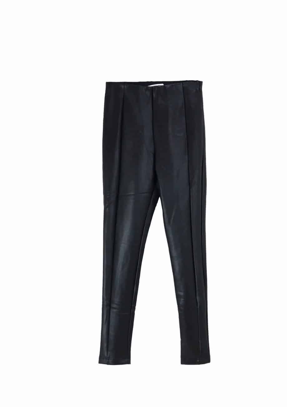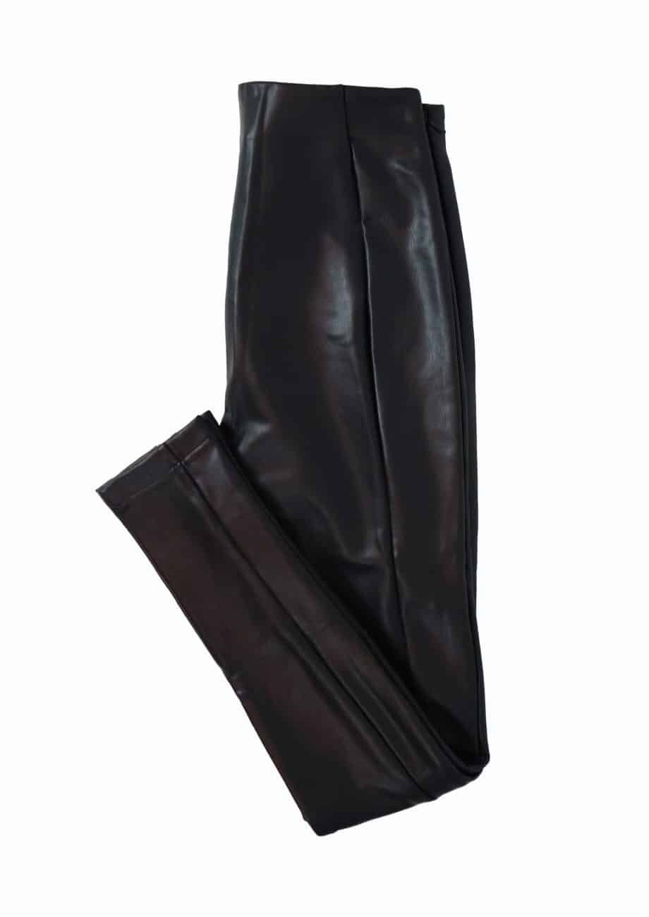 Mot. dirbtinės odos kelnės, juodos spalvos, siaurėjančio kirpimo, prigludusios, užsegimas užtrauktuku, elastingas juosmuo.