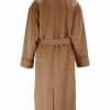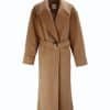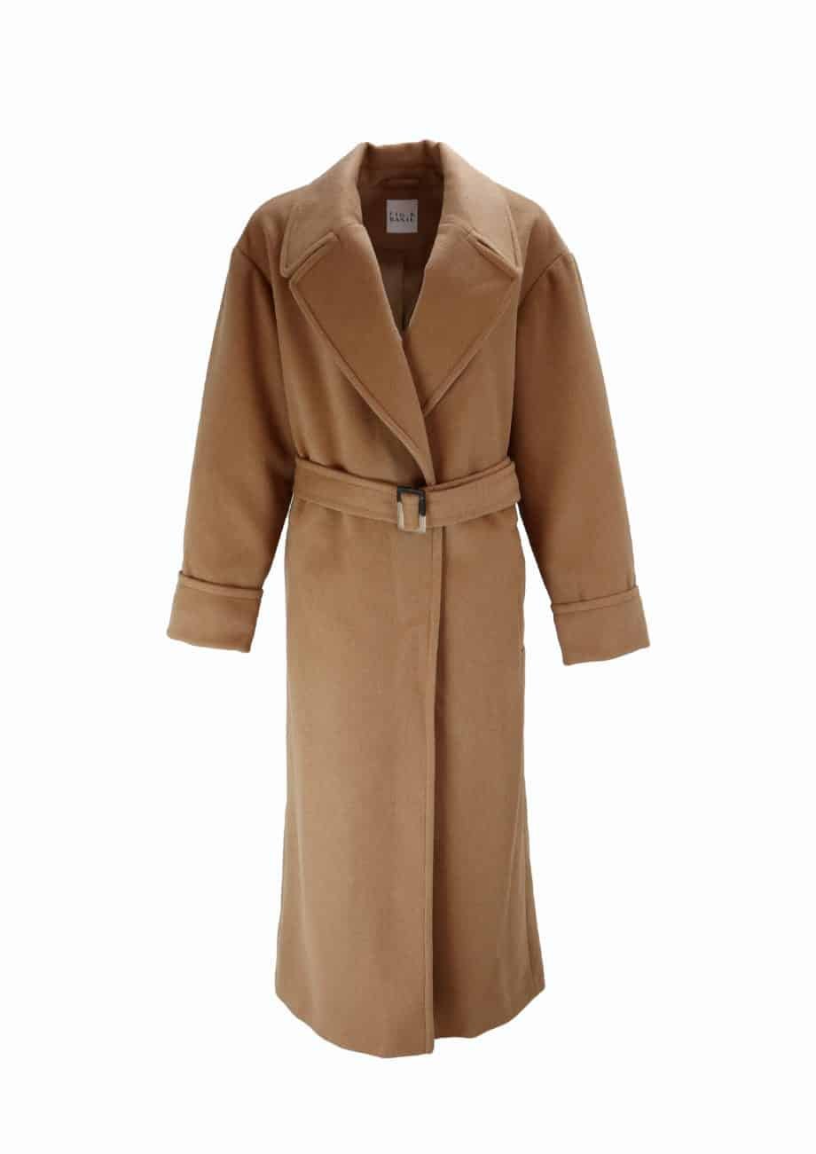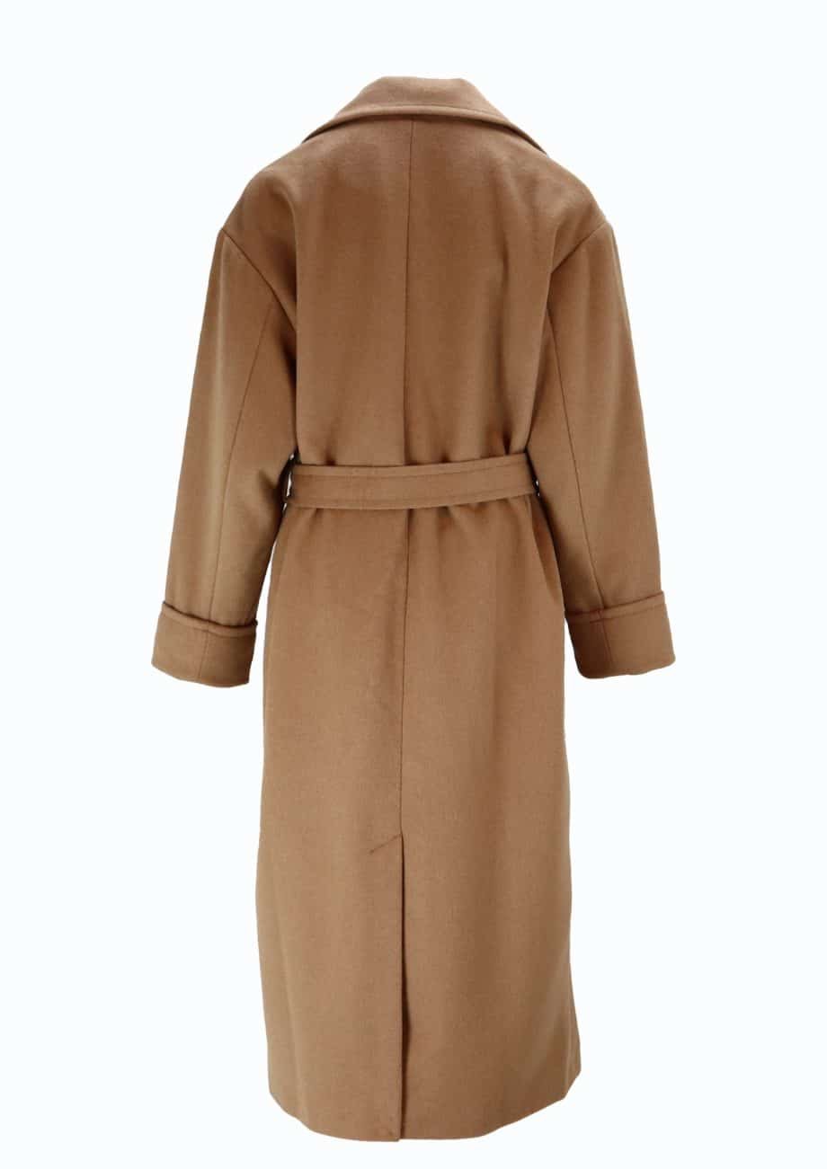 Mot. paltas, rudos spalvos, ilgomis rankovėmis, V formos iškirptė, atlenkiama apykaklė, tiesaus kirpimo, be užsegimo- surišamas diržu, šoninės kišenės.