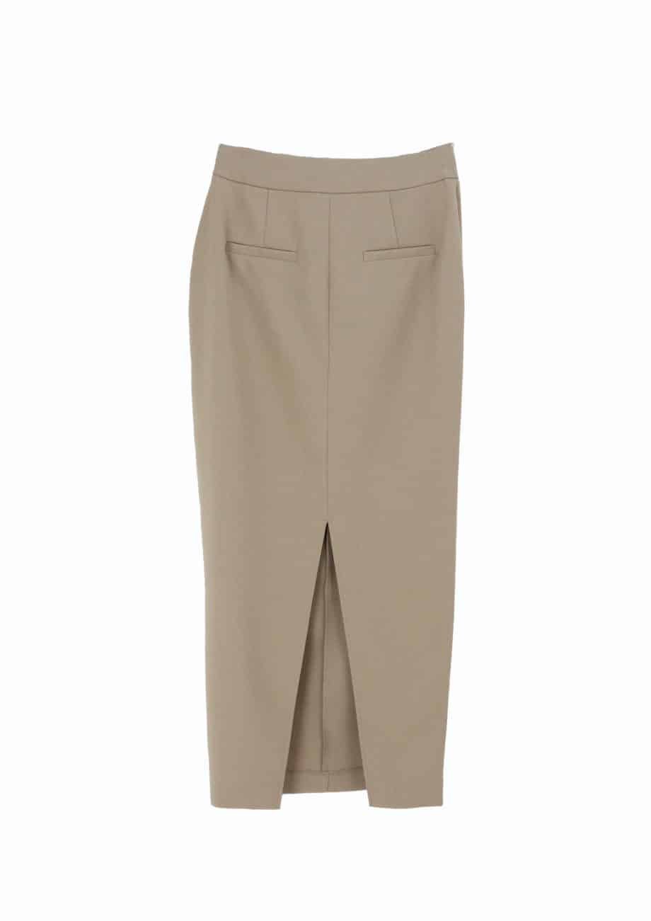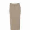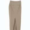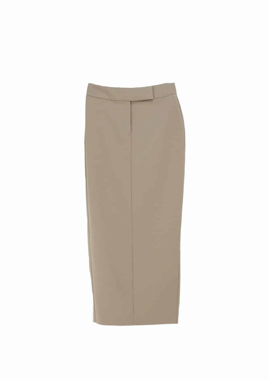 Mot. sijonas, smėlio spalvos, midi ilgis, aukštas liemuo, užsegimas užtrauktuku ir sagute, skeltukas sijono apačioje, prigludes.