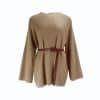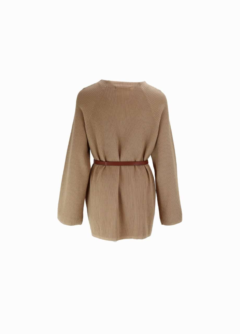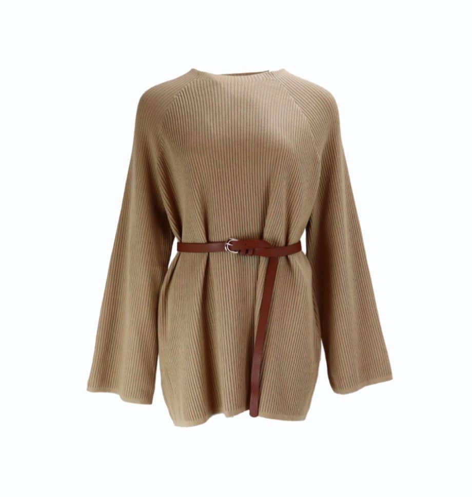 Mot. megztinis, rudos spalvos, ilgomis rankovėmis, apvali iškirptė, laisvo kirpimo, megzto rašto, liemens diržas.