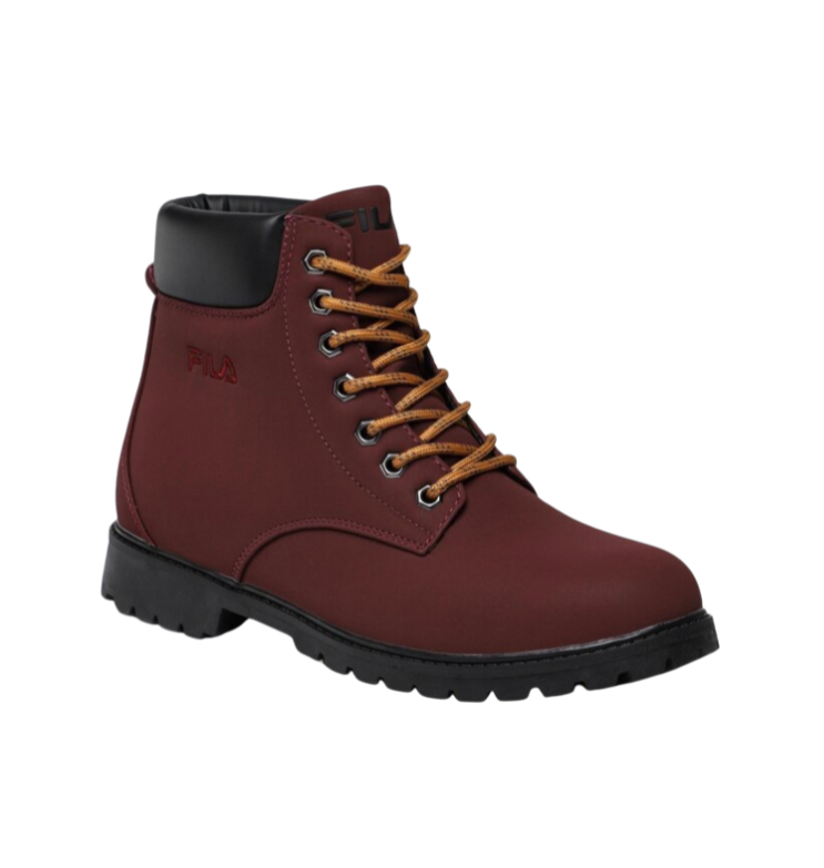 Mot. žygio batai, vyšninės spalvos, apvali batų nosis, suvarstomi medžiaginiais batraiščiais, plokščias padas.