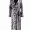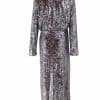 Mot. suknelė, sidabrinės spalvos, ilgomis rankovėmis, V formos iškirptė, surišama dirželiu, maxi ilgis, blizgučių dekoras.