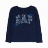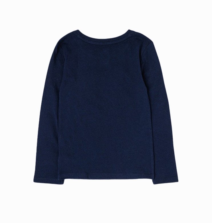 Vaik. marškinėliai, ilgomis rankovėmis, tamsiai mėlynos spalvos, apvali kaklo iškirptė, logotipo spauda.