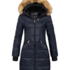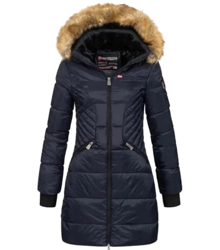 Mot. striukė mėlynos spalvos, su gobtuvu, turi dvi kišenes, tiesaus kirpimo , užsegimas užtrauktuku.