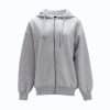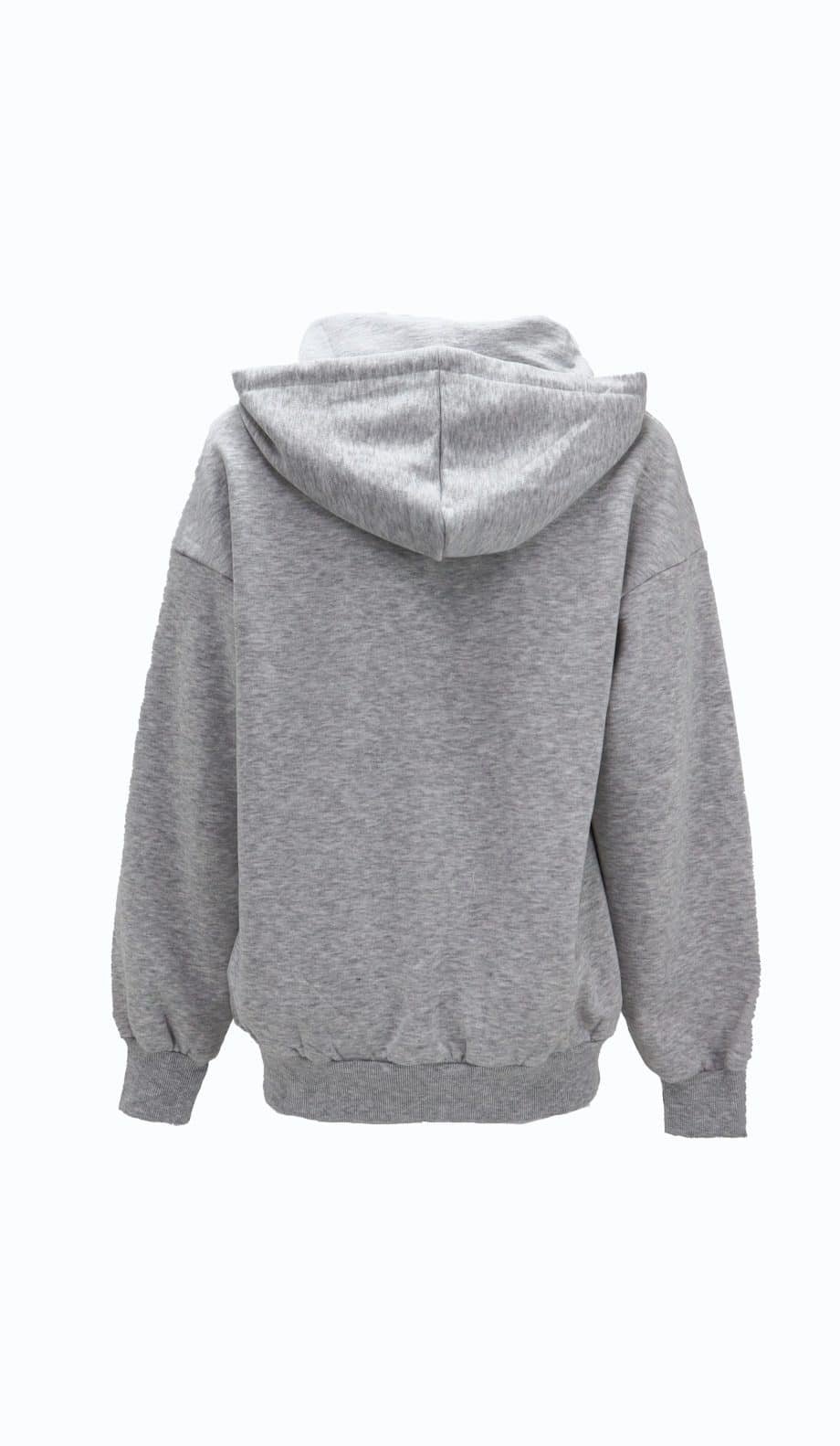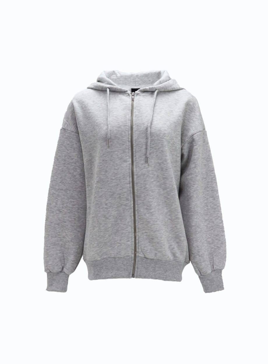 Mot. džemperis, pilkos spalvos, ilgos rankovės, gobtuvas su raišteliais, užsegimas užtrauktuku, elastingas juosmuo.